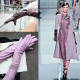 秋冬女士头层羊皮长手套薄款加厚保暖过肘半指露指手臂套真皮粉紫