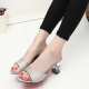 2017韩版拖鞋女夏高跟金色粗跟鱼嘴鞋时尚百搭水晶鞋凉拖中跟鞋女