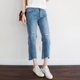 韩国破洞牛仔裤女早春九分直筒小脚裤裤脚不规则显瘦磨白毛边女裤