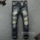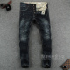 2017意大利欧美深色磨破洞小脚牛仔裤男 潮 修身小直筒复古潮