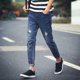秋季新款九分牛仔裤男学生青少年弹力修身韩版9分破洞哈伦小脚裤