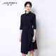 佳纷女装2017春夏季新款蓝色斜下摆职业衬衫领七分袖中长款连衣裙