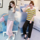 2017新款孕妇夏装两件套时尚款孕妇条纹上衣阔腿托腹裤怀孕妇套装