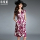 欧黎蔓2017夏季新款时尚印花真丝连衣裙V领修身腰带桑蚕丝中长裙