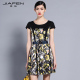 佳纷女装2017春夏季新品短袖圆领印花中长款碎花雪纺连衣裙A字裙