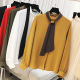晓梦蝴蝶2017早春新款搭配撞色飘带小立领灯笼袖宽松雪纺衬衫上衣