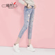 嫣然百分百2016春夏新品韩版休闲百搭韩火玲蕾丝破洞牛仔九分裤