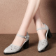 2017夏新品镂空一字扣牛皮女鞋尖头包头中跟粗跟妈妈鞋凉鞋女皮鞋