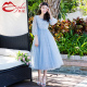美妃2017春夏新款圆领九分袖灯笼袖网纱绣花修身连衣裙女LQ8035-1