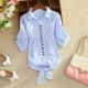 2017新款女装夏装新款显瘦竖条纹系带短袖衬衫学生百搭蝴蝶结衬衣