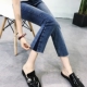 四季款韩国水洗毛边裤脚拼色修身微喇牛仔裤女高腰显瘦八九分裤子