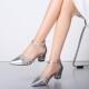 真皮水钻中跟单鞋女夏2016新款一字扣带包头凉鞋浅口粗跟银色女鞋