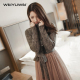 2017春秋新款压褶几何图案收腰连衣裙中长款长袖打底女韩版长裙