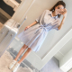 蓝白条纹衬衫裙女中长款2017新款韩版收腰蝴蝶结夏季a字连衣裙子
