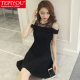 裙子女夏2017新款学生韩版文艺黑色蕾丝网纱无袖露肩一字领连衣裙