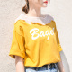 夏季新款女学生时尚性感拼网纱字母露肩宽松打底圆领短袖T恤上衣