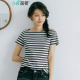 茵曼2017夏装新款百搭纯棉条纹一字领短袖T恤女士半袖体恤衫上衣