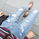 破洞牛仔裤女宽松直筒学生浅色bf乞丐裤2017夏季新款哈伦九分裤