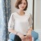 网纱拼接雪纺衫女短袖2017新款喇叭袖一直领露肩上衣蕾丝一字肩潮