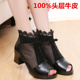 春夏真皮鱼嘴中年妈妈凉鞋女式中跟网纱粗跟厚底女鞋高跟镂空靴子