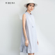 立领无袖纯棉宽松连衣裙女中长款2017春夏新款蓝色褶皱竖条纹裙子