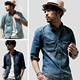 夏装 日系古着 优质潮男水洗修身七分袖牛仔衬衫