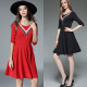 夏装新款韩版时尚立领撞色假两件修身连衣裙女喇叭袖收腰荷叶裙潮