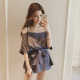 2017春夏新款韩版一字领露肩吊带上衣女五分袖收腰系带休闲t恤裙
