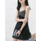 2017春夏新款简约黑白拼色七分袖字母印花短裙镂空露肩连衣裙