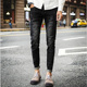 伊名杰秋冬修身潮流牛仔裤男小脚裤哈伦裤青年刮烂牛仔长裤黑色潮