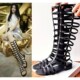 欧美夏天高帮大码平底凉鞋女露趾交叉绑带长靴高筒洞洞罗马凉靴女
