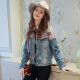 MIUCO欧洲站春装女2017新款拼接蕾丝绣花贴布破洞短款牛仔外套潮