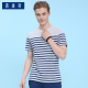 真维斯纯棉T恤男 2017夏装新款 男装圆领纯色拼条纹修身短袖上衣