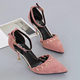 2017春季新款尖头粗跟一字扣单鞋 性感窜珠脚链高跟浅口凉鞋女鞋