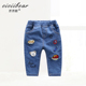 齐齐熊 春装婴儿牛仔裤休闲外出衣服卡通贴布绣长裤男女宝宝裤子