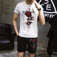 陌步2017夏季潮男圆领短袖T恤套装修身玫瑰印花修身纯棉T恤2件套