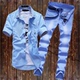 春夏季韩版男式装短袖牛仔衬衫长裤子套装休闲潮流寸衫衬衣服外套