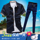 新款男装春夏季衬衫短袖男士衬衣牛仔长裤休闲一套装男搭配上衣服