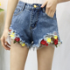 春夏2017新款韩版时尚重工刺绣花朵网纱拼接高腰牛仔短裤热裤B12