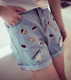 韩版宽松休闲刺绣松紧腰卡通女士短裤夏季 百搭牛仔裤学院风学生