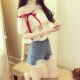 学院风吊带露肩喇叭袖衬衫个性系带收腰不规则细条纹半身裙套装潮