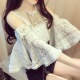 2017春夏新款日系小清新花边圆领露肩喇叭袖勾花镂空蕾丝衬衫上衣