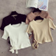 夏季新款韩版木耳边半高领 短袖t恤女针织打底衫修身钉珠螺纹体恤