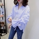 韩范2017春装新款学生V领蓝白条纹衬衫女长袖宽松百搭蝴蝶结衬衣