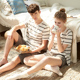 Gukoo/果壳秋季简约字母印花竖条纹裤家居服睡衣情侣家居睡衣套装