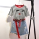 2017春装 条纹撞色海军服针织衫女短袖t恤女 宽松上衣白色打底衫