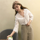 2017韩国女装春装新款小清新V领波浪边宽松套头九分袖蕾丝衫衬衫