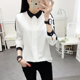 悦娜娃娃领雪纺衫女长袖2017春装新款白色学院风雪纺衬衫撞色衬衣