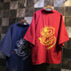自制款古着原宿风龙刺绣宽松大板型半袖 亮面T恤