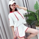 17夏季新款韩版女斜肩破洞印花字母短袖T恤+高腰条纹阔腿短裤套装